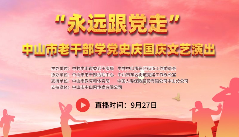為深入學(xué)習(xí)貫徹習(xí)近平總書記“七一”重要講話精神,深化黨史學(xué)習(xí)教育成果,慶祝中華人民共和國成立72周年,展示新時(shí)代老干部的精神風(fēng)貌。市委老干部局和東區(qū)街道黨工委聯(lián)合主辦的“永遠(yuǎn)跟黨走”中山市老干部學(xué)黨史慶國慶文藝演出于9月27日舉行,中山網(wǎng)將全程直播,敬請關(guān)注。