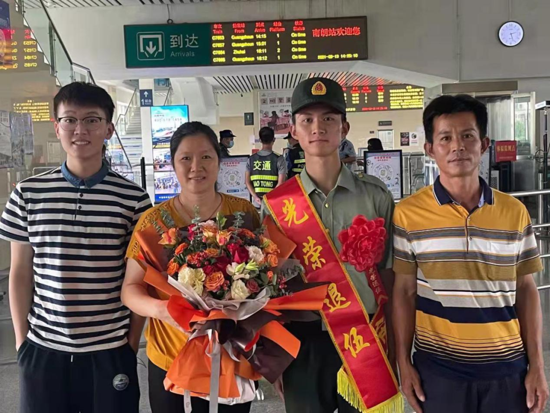 “去時鑼鼓喧天,歸來夾道歡迎?!?/p> 九月,正是退役軍人 從祖國各座軍營 返回家鄉(xiāng)的退役季 為營造“一次參軍、一生光榮”的濃厚氛圍 讓退役軍人感受到家鄉(xiāng)人民的熱情和關(guān)懷 激發(fā)老兵退伍不褪色 返鄉(xiāng)建新功的壯志熱情 9月13日下午,五桂山街道2021年首位退役軍人曾世紀光榮退役返鄉(xiāng)。街道退役軍人服務中心負責人、社區(qū)“兩委”干部、工作人員以及曾世紀的父母早早手持鮮花,在城軌南朗站等候迎接世紀回家。 回想2019入伍歡送大會時曾世紀代表五桂山即將入伍的新兵作表態(tài)發(fā)言,那年,他主動請纓,到艱苦邊遠地區(qū)服役。“參軍不僅是個人的榮耀,也是家人的榮耀,更是鄉(xiāng)親們的榮耀。到了部隊后我會堅決服從命令,聽從指揮,刻苦訓練,勤學本領(lǐng),絕不辜負家鄉(xiāng)人民的期望!”