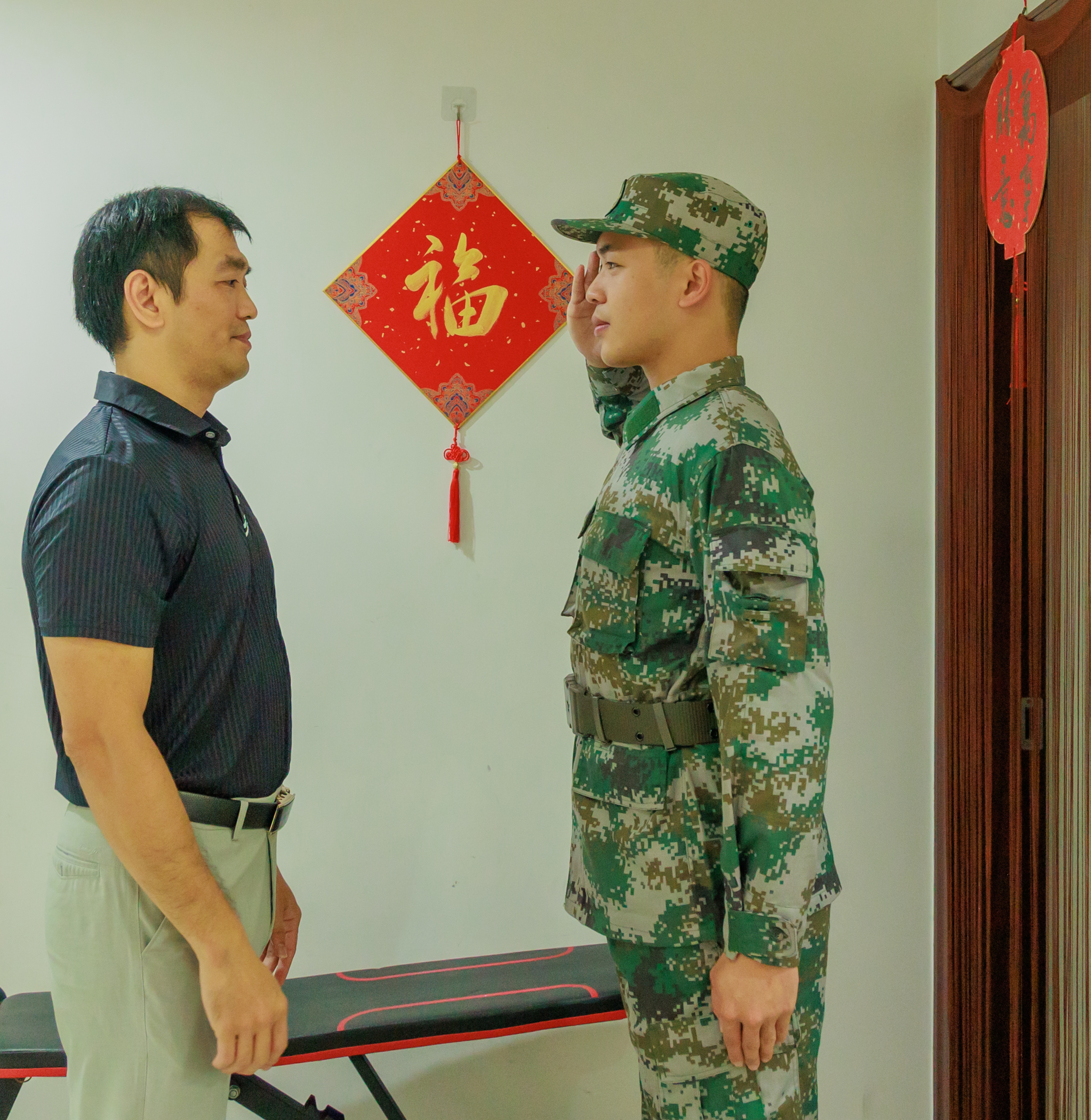 “我將把五彩的夢想交給迷彩去儲藏……”9月8日,中山市東區(qū)街道舉行2023年下半年入伍青年歡送座談會,新兵代表楊尚霖激動地說。楊尚霖現(xiàn)已領(lǐng)取入伍通知書,并前往中山市國防教育基地開展役前訓(xùn)練,幾天后將啟程前往部隊服役。 楊尚霖給父親敬禮。馬衛(wèi)星 攝