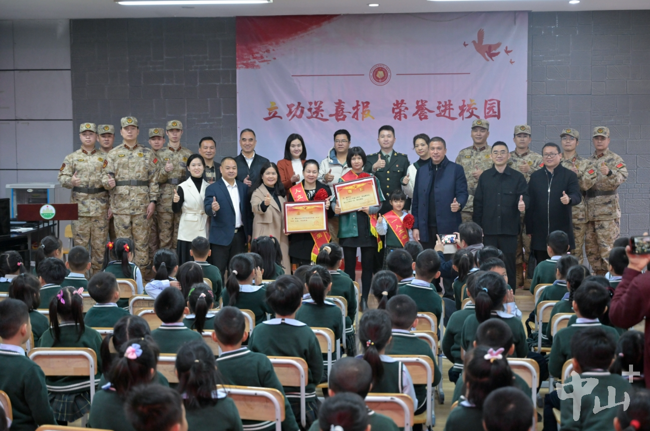 拉橫幅、敲鑼鼓、舞龍獅……2月29日一早,東區(qū)街道竹苑社區(qū)迎來了一支敲鑼打鼓、舞龍舞獅的隊伍,一路喜氣洋洋,熱鬧非凡。游行隊伍將一份立功受獎的榮譽,帶到了榮立三等功的現(xiàn)役軍人孫鍵女兒孫頌雅所在的竹苑小學(xué),熱鬧的場面吸引許多鄉(xiāng)親、商戶等前來圍觀祝賀。 聯(lián)合送喜報,儀式感拉滿 校園內(nèi),在讀小學(xué)一年級的“軍娃”孫頌雅和她的同學(xué)、老師等共同見證了這一榮耀時刻。東區(qū)街道黨工委書記周俊峰將三等功喜報送到孫頌雅一家人手上,市退役軍人事務(wù)局黨組成員、副局長陳光林為他們送上慰問金,并為其佩戴光榮綬帶“一人立功,全家光榮”,一家人臉上洋溢著開心且自豪的笑容。  孫頌雅一家人在學(xué)校收到立功喜報。記者 易承樂 攝