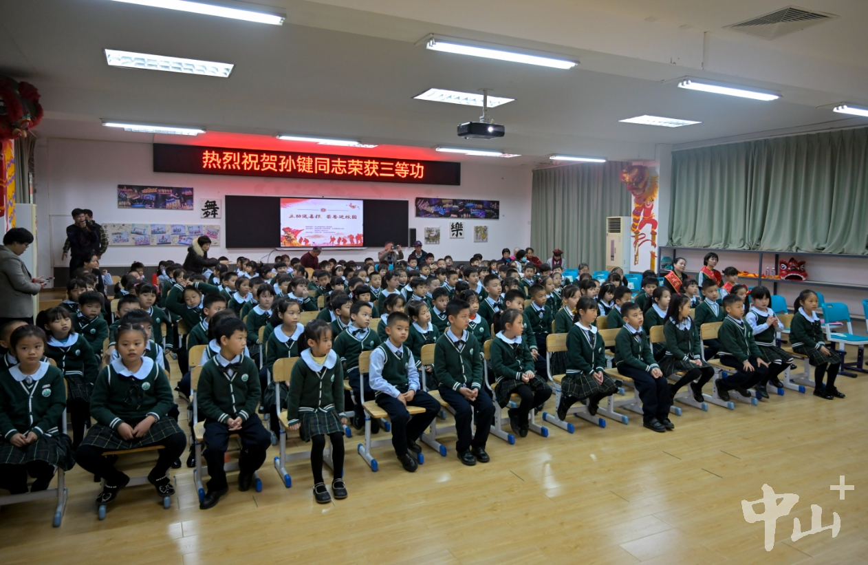 喜報一頭連著軍心士氣,一頭系著軍屬情懷。活動現(xiàn)場,榮立三等功的現(xiàn)役軍人孫鍵通過視頻向女兒說出心里話:“我最親愛的女兒頌雅,爸爸多么想陪伴在你的身邊,每一個節(jié)假日,每一天,看著你慢慢地成長。但是天下雖安,忘戰(zhàn)必危。國無防不立,民無兵不安,爸爸要保家衛(wèi)國。我的女兒,希望你理解和體諒爸爸的不能陪伴。爸爸也曾經(jīng)是竹苑小學(xué)的學(xué)生,從這里走出去,走向祖國更需要爸爸的地方……” 據(jù)介紹,2014年起至今,孫鍵在中國人民解放軍某部隊服役,因表現(xiàn)突出榮獲“四有”優(yōu)秀士兵、榮立三等功。因常年在部隊,孫鍵不能像其他孩子的父親那樣給予女兒更多關(guān)愛和陪伴,他們只能通過手機交流。 孫鍵的妻子郭麗說:“丈夫從小就想當兵,大學(xué)畢業(yè)后他選擇參軍報國,我們一直默默支持他。今天的儀式太隆重了,我平時很少跟女兒講爸爸的工作到底是什么,孩子的性格有點內(nèi)向,爸爸想讓女兒在學(xué)校過得更開心,更開朗一些。” 開展紅色宣講,愛國主義教育進校園 記者現(xiàn)場看到,活動還邀請了“中國好人”、東區(qū)街道退役軍人紅旗志愿服務(wù)隊隊長李克為大家上了一堂生動的愛國主義教育課,并將移動軍旅展覽館帶到校園,通過紅色宣講和軍旅物品展示,把愛國情懷厚植于小朋友們幼小的心靈中。  為孩子們上愛國主義教育課。記者 易承樂 攝