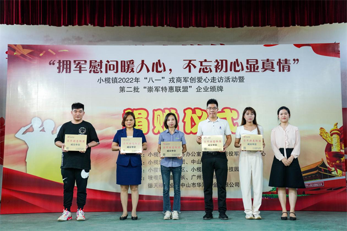 7月24日,小欖鎮(zhèn)舉行“擁軍慰問暖人心,不忘初心顯真情”——2022年“八一”愛心走訪活動啟動暨第二批“崇軍特惠聯(lián)盟”企業(yè)頒牌儀式。該鎮(zhèn)副鎮(zhèn)長鄧泳標(biāo)、市退役軍人服務(wù)中心副主任高亞男及鎮(zhèn)公共服務(wù)辦、退役軍人服務(wù)中心、高沙社區(qū)、中山好人工作室相關(guān)負(fù)責(zé)人,小欖愛心助學(xué)團(tuán)志愿者、愛心企業(yè)及第二批市“崇軍特惠聯(lián)盟”企業(yè)的代表以及部分優(yōu)秀退役軍人代表近100人參加了活動。