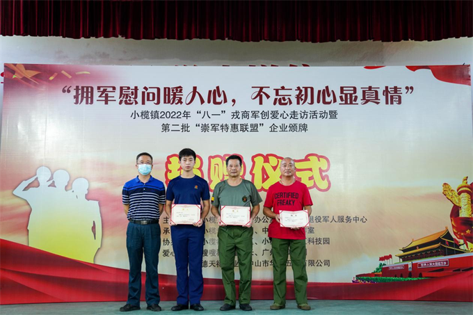 ▲小欖鎮(zhèn)2022年“八一”愛心走訪活動啟動現(xiàn)場。 活動現(xiàn)場,相關(guān)領(lǐng)導(dǎo)為贊助本次走訪活動的4家愛心企業(yè)和小欖鎮(zhèn)第二批加入中山市“崇軍特惠聯(lián)盟”的10家企業(yè)代表逐一頒發(fā)紀(jì)念牌,并為該鎮(zhèn)3位“中山市老兵宣講團(tuán)”成員——歐耀強(qiáng)、蔡永志、張昊明頒發(fā)聘書。隨后,榮立一等功的老兵歐耀強(qiáng)用樸實而生動的語言講述自己如何帶領(lǐng)身邊戰(zhàn)友在艱苦的環(huán)境下堅持戰(zhàn)斗取得勝利,和大家分享自己10年軍旅生涯的點點滴滴。歐耀強(qiáng)勉勵大家把責(zé)任和忠誠作為重要精神支柱、以主人翁的心態(tài)愛護(hù)我們的家園。