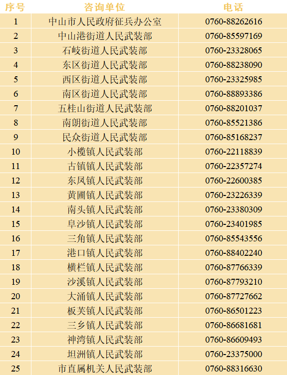 2025年全國征兵(男兵)應(yīng)征報名已于12月1日開始。記者從中山市人民政府征兵辦公室獲悉,即日起,符合條件的青年可通過官方渠道報名參軍,對于征兵政策和流程存有疑問的市民,可通過撥打各鎮(zhèn)街征兵咨詢電話獲得詳細(xì)解答。 應(yīng)征報名(男兵) 應(yīng)征報名提示:男兵報名前須完成兵役登記 全國征兵(男兵)2025年應(yīng)征報名時間 上半年應(yīng)征報名:2024年12月1日至2025年2月10日24時 下半年應(yīng)征報名:2024年12月1日至2025年8月10日24時 男兵應(yīng)征報名對象 高中(含中專、職高、技校)畢業(yè)生及以上文化程度的青年(含高校在校生),年滿18至22周歲(2003年1月1日——2007年12月31日出生);普通高等學(xué)校本??飘厴I(yè)生、上半年符合畢業(yè)條件的畢業(yè)班學(xué)生,年滿18至24周歲;研究生畢業(yè)生及在校生放寬至26周歲;初中畢業(yè)文化程度男青年,年滿18至20周歲。 應(yīng)征報名(女兵) 全國征兵(女兵)2025年應(yīng)征報名時間 上半年應(yīng)征報名:2025年1月1日至2025年2月10日24時 下半年應(yīng)征報名:2025年7月1日至2025年8月10日24時 女兵應(yīng)征報名對象 上半年應(yīng)征報名:普通高等學(xué)校和科研機(jī)構(gòu)全日制應(yīng)屆畢業(yè)生及在校生,年滿18至22周歲(2003年1月1日——2007年12月31日出生),全日制研究生應(yīng)屆畢業(yè)生及在校生放寬至26周歲;2024年普通高等學(xué)校全日制本專科應(yīng)屆畢業(yè)生可以報名參加2025年上半年女兵征集,年齡放寬至23周歲。 下半年應(yīng)征報名:普通高中應(yīng)屆畢業(yè)生、普通高等學(xué)校和科研機(jī)構(gòu)全日制應(yīng)屆畢業(yè)生及在校生,年滿18至22周歲(2003年1月1日——2007年12月31日出生),全日制研究生應(yīng)屆畢業(yè)生及在校生放寬至26周歲。 報名方式 報名方式征兵報名官方網(wǎng)站:全國征兵網(wǎng) www.gfbzb.gov.cn 軍隊媒體移動旗艦客戶端:中國軍號App 中山各鎮(zhèn)街征兵咨詢電話