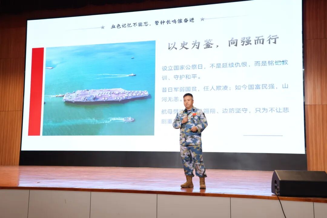 活動(dòng)邀請(qǐng)中山港口鎮(zhèn)人民武裝部副部長(zhǎng)賀洪彪以《銘記歷史守海疆 青春立志報(bào)家國(guó)》為題開(kāi)展專(zhuān)題講座,帶領(lǐng)師生重溫南京大屠殺那段山河破碎的屈辱歷史,闡釋國(guó)家公祭日的設(shè)立意義,讓師生深刻理解“銘記歷史、勿忘國(guó)恥”的意義。現(xiàn)場(chǎng)莊嚴(yán)肅穆,全體師生為南京大屠殺死難同胞默哀,用無(wú)聲的敬意寄托對(duì)逝者的哀思。 會(huì)上,賀洪彪結(jié)合自身十五載南沙守礁經(jīng)歷,講述“以礁為家、以苦為榮”的崢嶸歲月,用軍人的忠誠(chéng)與信仰,詮釋新時(shí)代國(guó)防衛(wèi)士守護(hù)家國(guó)的責(zé)任擔(dān)當(dāng),讓師生們真切感受到和平生活的來(lái)之不易。
