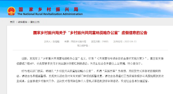 記者還了解到,2022年4月份國家鄉(xiāng)村振興局就在官網(wǎng)上發(fā)布相關辟謠聲明,并提醒社會各界群眾應提高警惕注意防范,發(fā)現(xiàn)類似活動及時向有關部門舉報或報警處置。