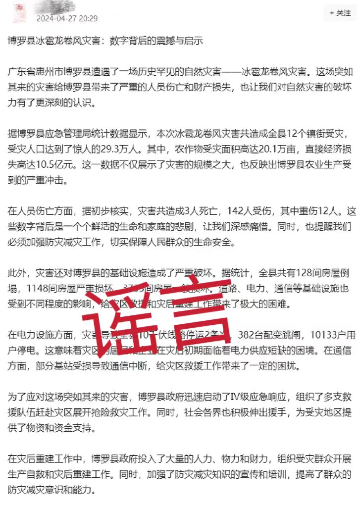 4月27日,博羅公安在工作中發(fā)現(xiàn),有網(wǎng)民在某平臺發(fā)布文,稱“博羅縣遭遇一場歷史罕見的自然災(zāi)害-冰雹龍卷風(fēng)”“災(zāi)害造成3人死亡,142人受傷,其中重傷12人”。