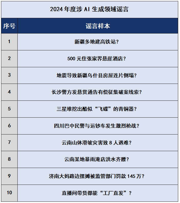 2024年初,“新疆多地建高鐵站”虛假短視頻在網(wǎng)上流傳,此類視頻由軟件智能合成,用戶只需使用指定視頻模板、手動(dòng)替換涉本人家鄉(xiāng)相關(guān)地點(diǎn)的文字即可生成新視頻,利用人們對(duì)家鄉(xiāng)基礎(chǔ)設(shè)施建設(shè)情況的關(guān)注而大肆傳播,誤導(dǎo)公眾。還有個(gè)別網(wǎng)民為獲取流量和不當(dāng)利益,利用AI軟件蓄意歪曲“交警請(qǐng)占道停留的運(yùn)鈔車駛離”的事實(shí),編造謠言“四川巴中民警與運(yùn)鈔車發(fā)生激烈槍戰(zhàn)”,造成公眾恐慌和誤解。此外,謠言“濟(jì)南大媽路邊擺攤被監(jiān)管部門罰款145萬(wàn)”實(shí)為AI工具生成的虛假文章,大肆消費(fèi)公眾的同情心博取眼球,引發(fā)大范圍傳播,造成不良社會(huì)影響,相關(guān)違法人員被公安機(jī)關(guān)依法行政拘留?!霸颇仙襟w滑坡災(zāi)害致8人遇難”“地震導(dǎo)致新疆烏什縣房屋連片倒塌”“云南某地暴雨淹店洪水齊腰”等謠言則純屬子虛烏有,均為AI特效炮制的虛假視頻,利用公眾對(duì)災(zāi)難事件的重視編造傷亡情況,制造恐慌情緒,擾亂社會(huì)秩序。