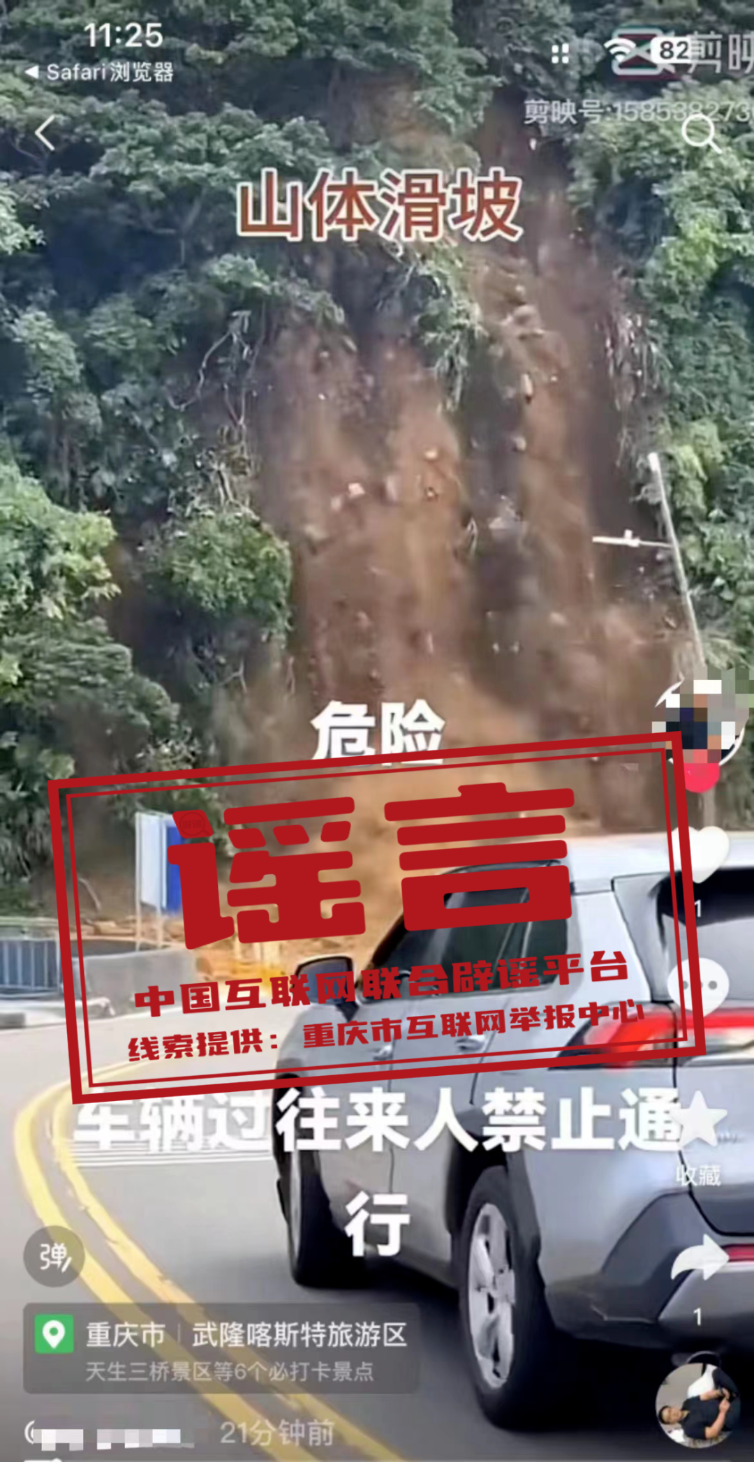 真相:近日,有網(wǎng)民發(fā)布了一則“山體滑坡危險,過往車輛行人禁止通行”的視頻,視頻定位標注為“重慶市武隆喀斯特旅游區(qū)”。經(jīng)重慶市武隆區(qū)多部門核實,該區(qū)近期未發(fā)生大面積山體滑坡事件。網(wǎng)傳視頻實為2024年6月3日臺灣省基隆市中正區(qū)潮境公園入口發(fā)生的大規(guī)模山體滑坡事件,而視頻中所標注的定位信息系網(wǎng)民發(fā)布視頻的地點,而非事件發(fā)生的地點。(來源:“重慶辟謠”微信公眾號、網(wǎng)信武?。?/span>