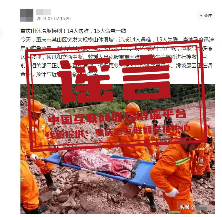 真相:7月2日,某網(wǎng)民發(fā)布信息稱,“重慶市某山區(qū)突發(fā)大規(guī)模山體滑坡,造成14人遇難,15人失聯(lián)?!苯?jīng)相關(guān)部門核實(shí),重慶近日未發(fā)生相關(guān)地質(zhì)災(zāi)害,網(wǎng)傳信息系謠言。(來(lái)源:重慶辟謠)