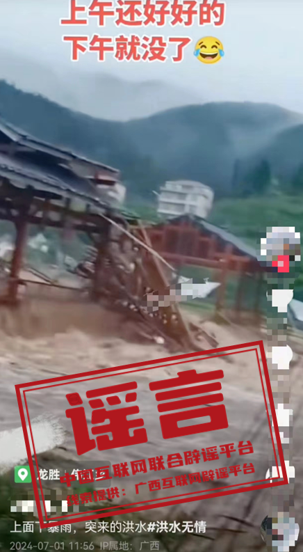 詳情:近日,有網(wǎng)民發(fā)布視頻稱“桂林龍勝一風雨橋被洪水沖毀”,并配文“上午還好好的,下午就沒了”,引發(fā)關(guān)注。經(jīng)當?shù)毓膊块T核實,偉江鄉(xiāng)轄區(qū)內(nèi)風雨橋完好無損,不存在倒塌的情況。該視頻系當?shù)鼐W(wǎng)民龍某某罔顧事實、故意編造,將網(wǎng)上看到的其他地方的風雨橋被毀視頻重新編輯并定位在偉江鄉(xiāng)進行發(fā)布。目前,警方已依法對龍某某予以行政處罰。(來源:廣西互聯(lián)網(wǎng)辟謠平臺、龍勝公安)