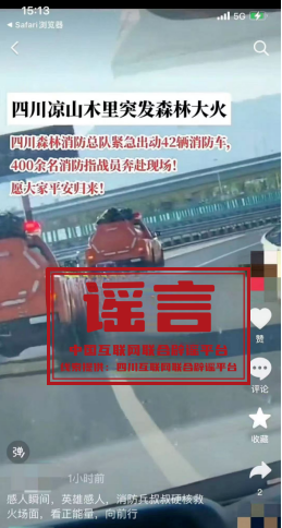 真相:近日,有網(wǎng)民在短視頻平臺(tái)上發(fā)布視頻,并配以“四川涼山木里突發(fā)森林大火,四川森林消防總隊(duì)緊急出動(dòng)42輛消防車,400余名消防指戰(zhàn)員奔赴現(xiàn)場(chǎng)”的文字。當(dāng)?shù)鼐W(wǎng)信部門聯(lián)動(dòng)應(yīng)急管理局進(jìn)行查核,證實(shí)四川涼山木里近日未發(fā)生森林大火。(來(lái)源:四川互聯(lián)網(wǎng)舉報(bào)辟謠平臺(tái))