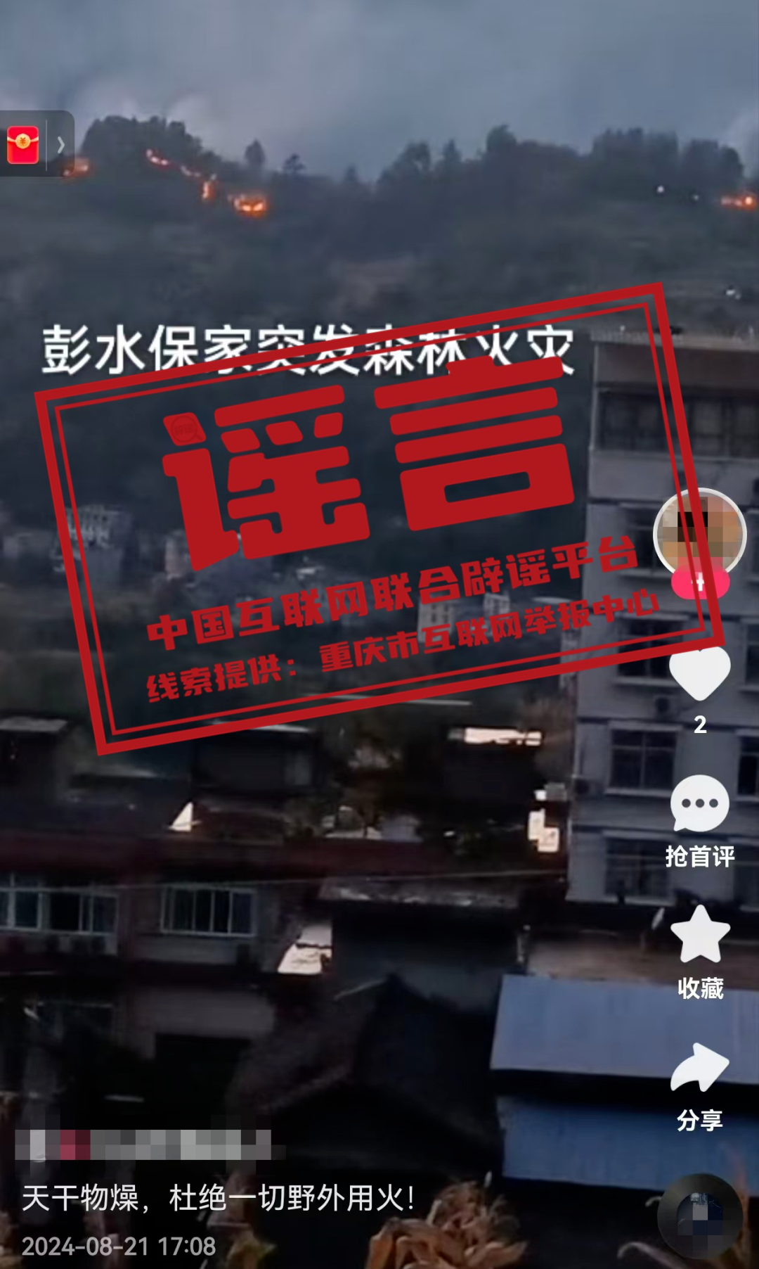 真相:8月21日,某網民發(fā)布視頻并配文“彭水保家突發(fā)森林火災”,引發(fā)關注。經屬地網信部門核實,重慶彭水近期未發(fā)生此類事件,網傳信息系謠言。目前,謠言線索已轉交相關部門對造謠者進行進一步調查處置。(來源:@重慶辟謠)
