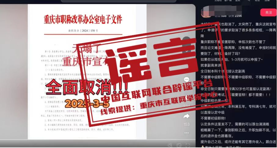 真相:近日,有網(wǎng)民在互聯(lián)網(wǎng)平臺發(fā)布消息稱“重慶市宣布,申請評審的要求取消了很多條條框框,職稱申請不看前置職稱,全日制本科十年直接認定副高,不需要中級職稱”,引發(fā)關(guān)注。經(jīng)核實,網(wǎng)傳信息系謠言。職稱評審均需逐級晉升,取得上一級職稱并滿足相應(yīng)學歷資歷條件后方可晉升高一級職稱。目前重慶市除特殊人才、博士后等3個針對特定對象的職稱申報綠色通道外,正常申報通道均需逐級晉升。網(wǎng)傳文件是網(wǎng)民通過P圖軟件編輯而成,試圖吸引不明真相的群眾咨詢,借機推銷職稱代辦服務(wù),收取高額費用。目前,謠言線索已轉(zhuǎn)交公安機關(guān)進一步調(diào)查處置。(來源:“重慶辟謠”微信公眾號)